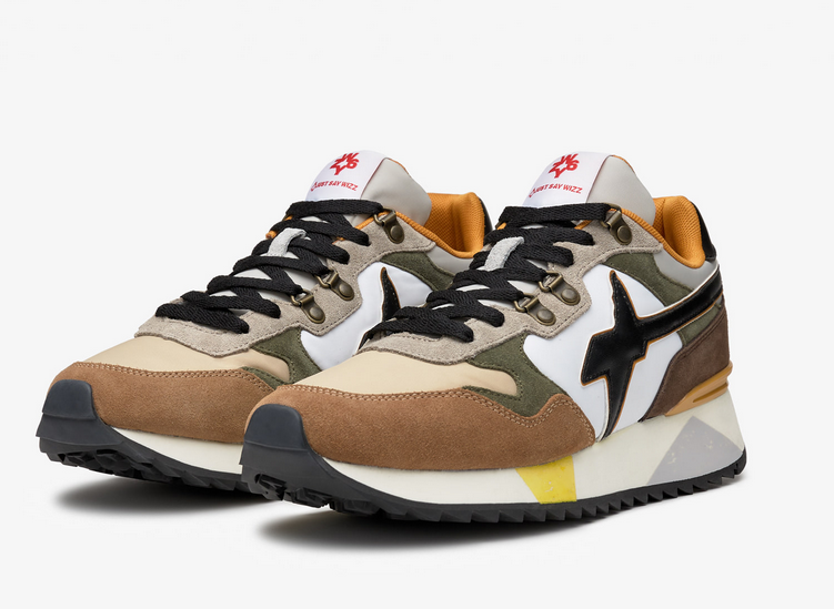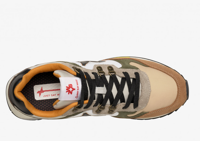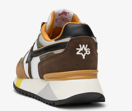 Le sneakers sono caratterizzate da un design in tre colori distinti: cuoio, militare e bianco. Questa combinazione cromatica conferisce un aspetto deciso e allo stesso tempo versatile, che si adatta facilmente a vari outfit. Il cuoio, scelto per la parte del tallone e per alcuni dettagli della tomaia, aggiunge un tocco di eleganza e durevolezza, mentre il colore militare richiama l’idea di robustezza e performance, perfetto per chi cerca un prodotto di alta qualità e resistenza. Il bianco, infine, dona freschezza e luminosità al design, creando un perfetto equilibrio tra i toni più intensi.